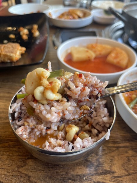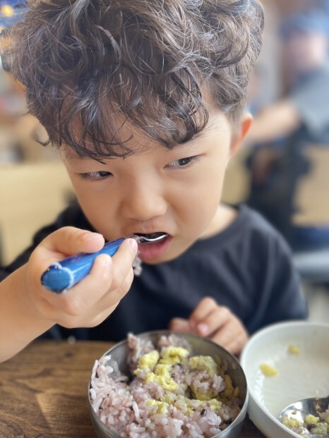 방문하기 전, 이집 후기를 보았을 때 동태전골뿐만 아니라 또하나 극찬했던 메뉴가 바로 구름계란찜이었다. 누군가는 인생 계란찜이었다며 극찬을 아끼지 않았는데,폭탄계란찜 참 많이 보긴 했지만, 일단 비주얼부터 정말 구름구름하다. 엄청 뜨거운데도 불구하고 바로 입안 직행! 극찬했던 이유를 알만하다. 너무 부드러운 식감, 목으로 부드럽게 넘어가는 느낌마저 정말 좋다. 밥에 슥삭비벼서 잘먹는 아드님.