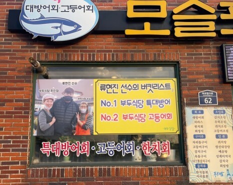 즐비하게 붙여진 연예인과 스포츠스타의 사인과 사진. 모슬포 맛집이다 보니 꽤 여러 사람이 방문했다.
