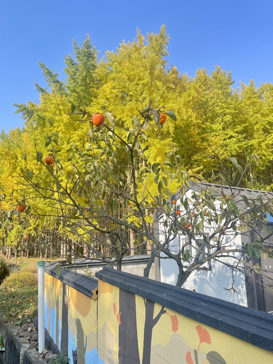 은행나무로 유명한 마을이라 담벼락에도, 집 명패에도 은행그림이 그려져 있다. 까치밥일 듯 한 붉은 단감마저 은행잎과의 어우러짐이 좋다.
