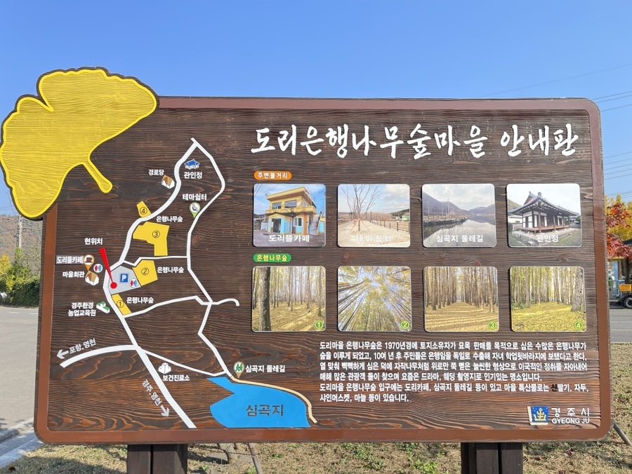 경주 북쪽에 위치한 "도리마을"은 내비게이션에서 은행나무숲이 연관 검색될 정도로 유명한 곳이었다. 최근 SNS에 올라오는 사진과 잇님들의 포스팅을 보며 한번 가봐야겠다고 마음 먹었던 곳. 마을 한켠에 꽤 큰 규모로 주차장이 마련되어 있고, 주차는 무료로 가능하다. 주차장 뒷편으로 노란 풍경이 멋진 모습을 보여주었다. 주변 산책 동선을 알아볼 수 있도록 되어 있으니 한번 훑어보고 가길 추천 드린다.