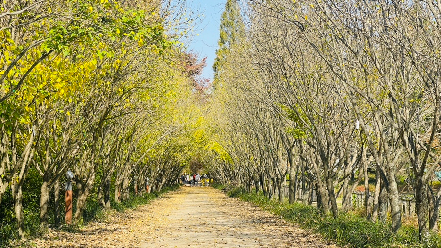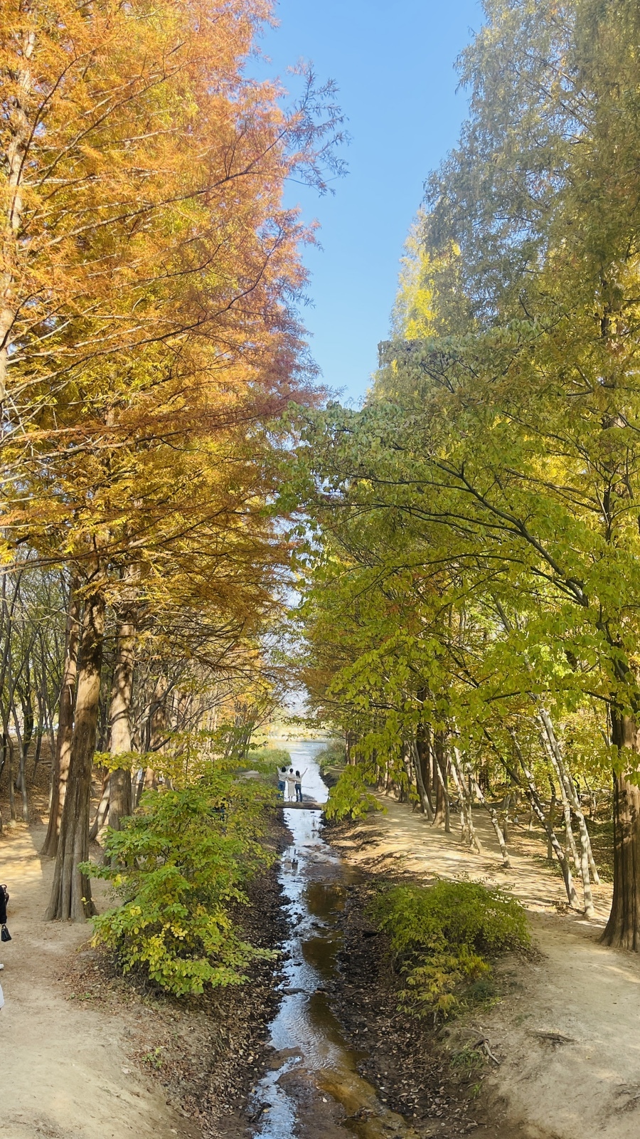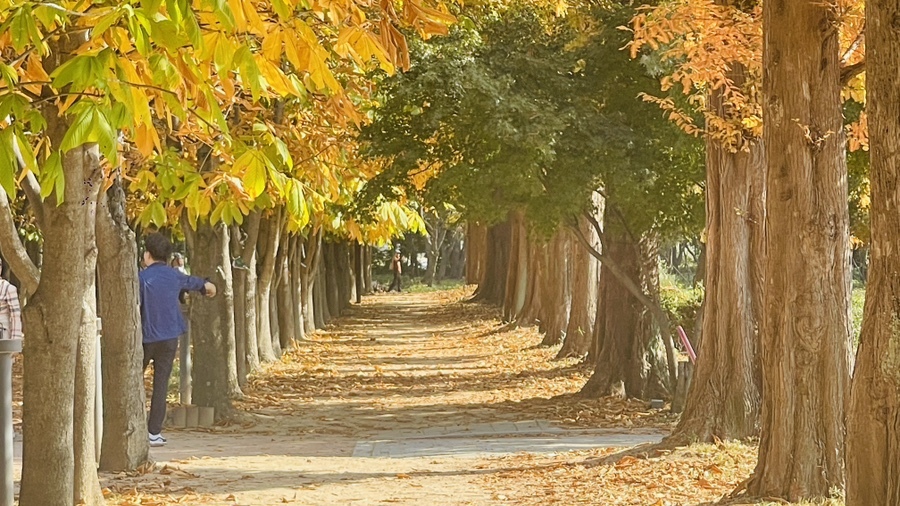 하지만 추천하고 싶은 곳은 넓은 가로수길이 아닌 바로 우측에 있는 좁은 가로수길. 촘촘한 나무와 노랗게 물든 잎이 만들어내는 풍경화 같은 곳이다.