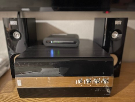 우퍼 스피커와 미니 공기청정기도 있고, 3병의 시원한 물이 준비되어 있다.