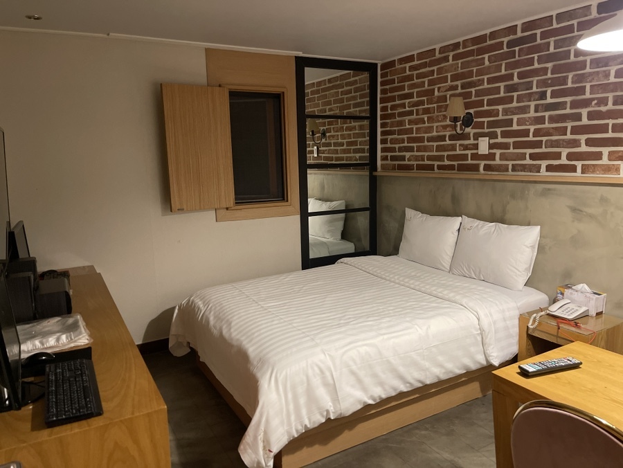 방 안에선 담배 냄새가 살짝 나기는 했다. 어쩔 수 없는 부분이긴 하다. 그럼에도 불구하고 연박 가능, 저렴한 비용 등의 장점이 좋다보니 대수롭지 않게 여겨진다. 지금 이곳은 5성급 호텔 부럽지 않은 곳이다. 다행히 침구류는 세탁을 깔끔하게 해서인지 좋은 냄새가 풍겨와 숙면하기엔 좋아 보였다. 창문도 닫으면 외부 소음이 들리지 않아서 좋다. 쓸일은 없었지만 PC 2대도 놓여져 있다.