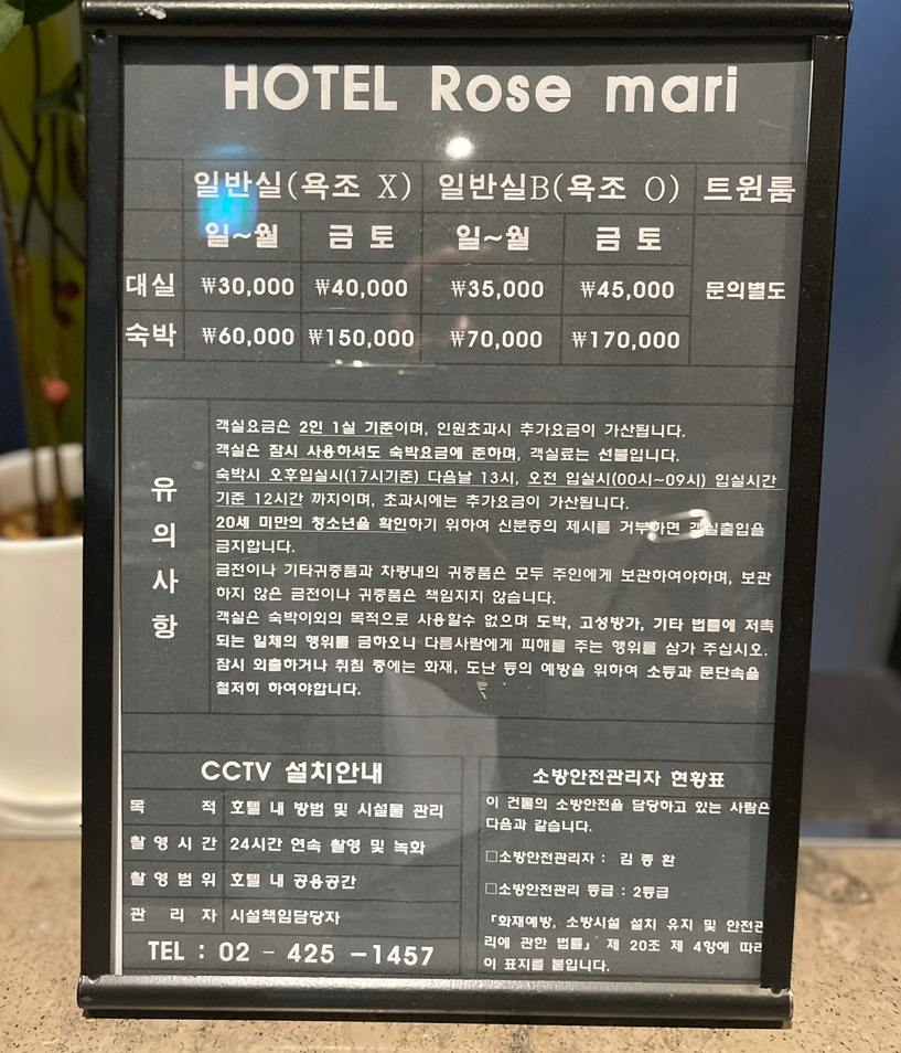 주말 요금이 살짝 황당하긴 하지만, 실제로 저렇게 받지는 않을 듯 하다. 우리가 투숙했던 욕조 없는 방의 화요일 객실료는 5만 원, 다음날부터는 1만 원 상승한 6만 원. 요일별로 약간 다른 요금이긴 하지만 서울에서 출장 숙소로 이 정도 가성비 숙소를 얻는 것만으로도 그저 기뻤다 연박 가능한 것이 가장 큰 행복이었다. 힘든 출장길을 가볍게 만들어 준 로즈마리모텔.. 지금도 감사하고 싶은 마음이다.