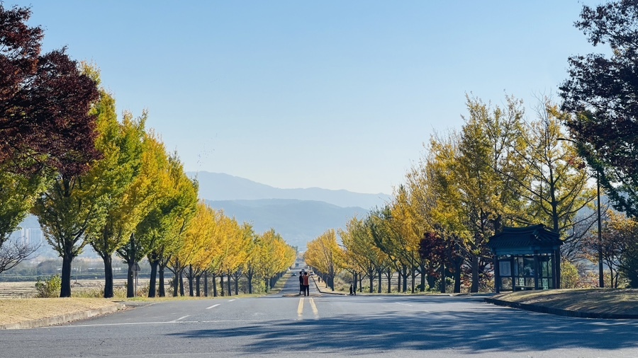 상당히 높은 곳에 올라서인지 앞서 보았던 가로수길의 은행나무가 한눈에 들어온다. 사진에 담긴 모습보다 실제로 보는 모습이 훨씬 멋지다. 경주 가을여행에서 빼놓을 수 없는 통일전. 은행나무와 함께 역사적인 가치도 있는 곳이기에 추천해보고 싶다.
