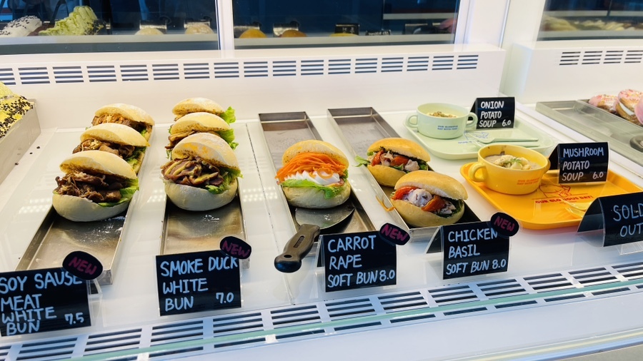 한라산모양을 닮은 한라산 시나몬롤부터 브런치 메뉴 샌드위치(잠봉버터, 당근라페, 치킨바질 등)와 수프(어니언 포테이토, 머쉬룸 포테이토)가 준비되어 있다. 시그니처 메뉴인 아망슈와 퀸아망, 특히 무지갯빛 한라봉 범벅은 퀸아망 사이에 크림을 가득 머금고 있어 먹음직하다. 이밖에 앙버터 맘모스롤, 단호박, 흑임자, 옥수수 등 시루떡모양의 베이커리와 초코, 황치즈, 말차와 제주 당근으로 만든 앵무새 알도 보인다.
