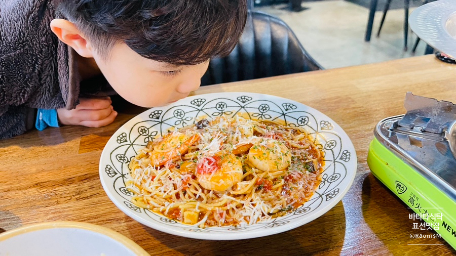 라온이가 먹고 싶어했던 쉬림프 토마토 파스타. 눈과 코로 맛보더니 입에 묻혀가며 먹을 정도로 맛나게 흡입한다. 나가면서 직원분에게 너무 맛있었다는 칭찬을 빼놓지 않을 정도로 아이입맛도 사로잡았다.