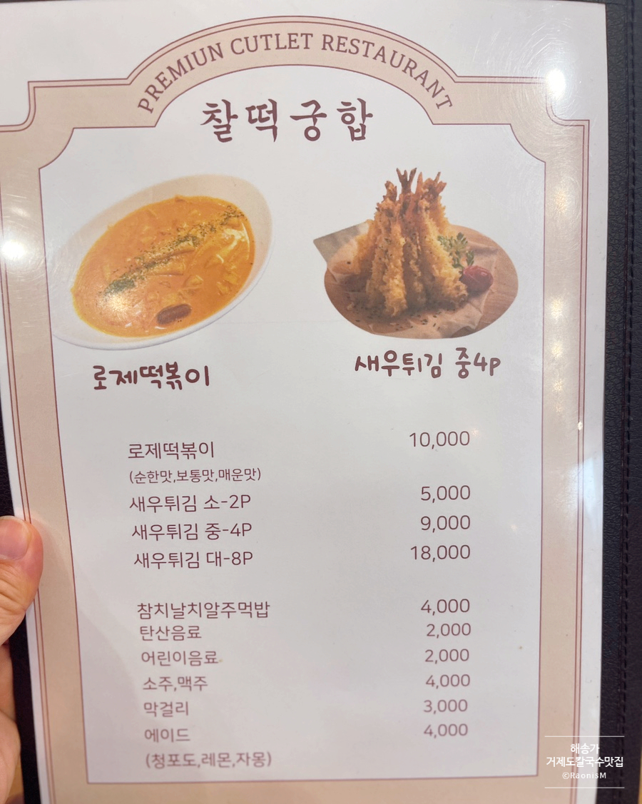 시그니처메뉴 새싹삼김치칼국수와 해송새우칼국수. 여러종류의 돈가스와 어린이세트가 준비되어 있다. 매콤한 음식을 좋아하는 분들을 위해 땡초 활용 메뉴가 많은게 눈에 띈다. 매운음식을 싫어한다면 주문 전에 미리 빼달라고 요청하면 된다. 메뉴 선택에 어려움을 겪는다면 찰떡궁합 메뉴로 주문해도 좋을 것 같다. 머리끈이 준비되어 있어 긴머리를 묶고 먹기에도 좋다. 돈가스 요리를 시키면 식전 수프가 제공된다.
