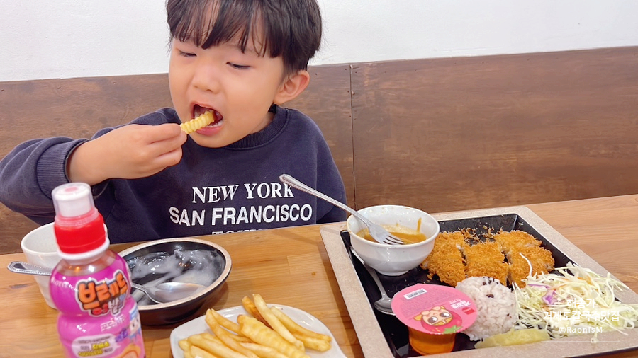 아이가 딱 좋아할 세트메뉴. 땅콩을 베이스로 한 고소한 소스와 제법 잘 어울리는 돈가스를 메인으로 감자튀김과 후식젤리, 어린이 주스까지. 아이가 좋아할 수 밖에 없는 조합으로 나왔다. 거제도 맛집! 아이와 한다면 이정도의 메뉴구성이면 최고일 수 밖에 없다.
