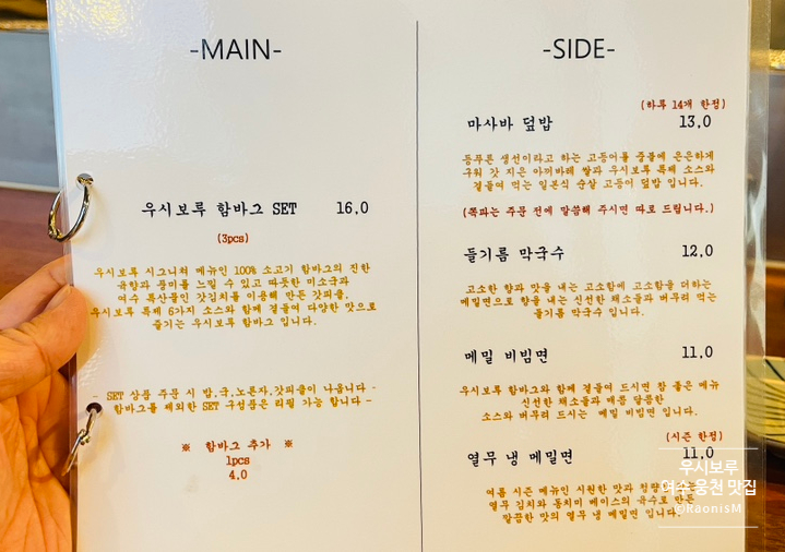 그냥 먹어도 맛있지만, 테이블마다 준비되어 있는 6가지 특제소스와 곁들여 먹어도 좋다. 청양고추, 표고와사비, 레몬마늘, 시치미, 땅콩가루와 타래간장이 바로 그것인데, 전부 매력적이다. 개인적으로는 표고와사비가 엄지척! 함바그를 주문하면 같이 서비스되는 간장계란밥도 놓치면 안될 존맛탱이다. 여수 웅천 우시보루 함바그와 한정수량 마사바덮밥은 무조건 즐겨야 될 메뉴이다.
