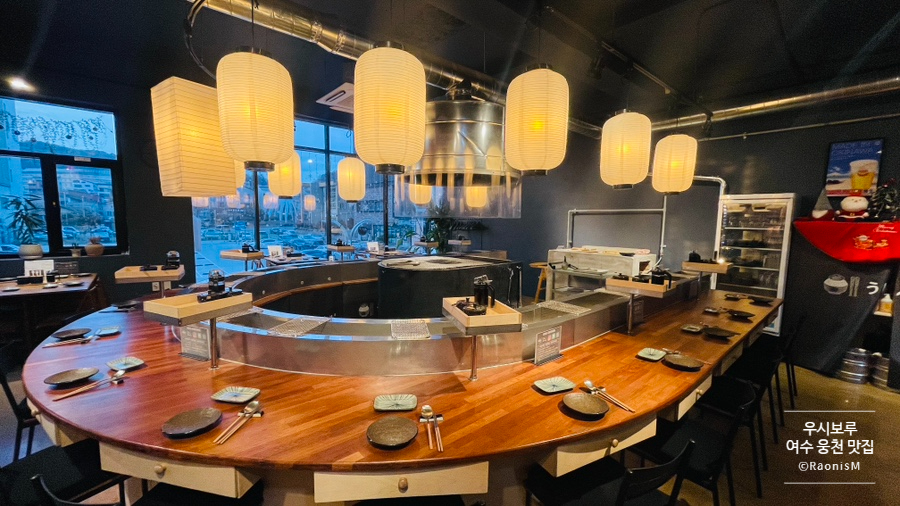 일본 현지의 느낌을 잘 살린 내부. 한가운데 대형화로가 설치되어 있고 카운터석과 몇개의 테이블이 놓여져 있다. 유아의자도 준비되어 있어 아이랑 식사하기에도 무난하다.