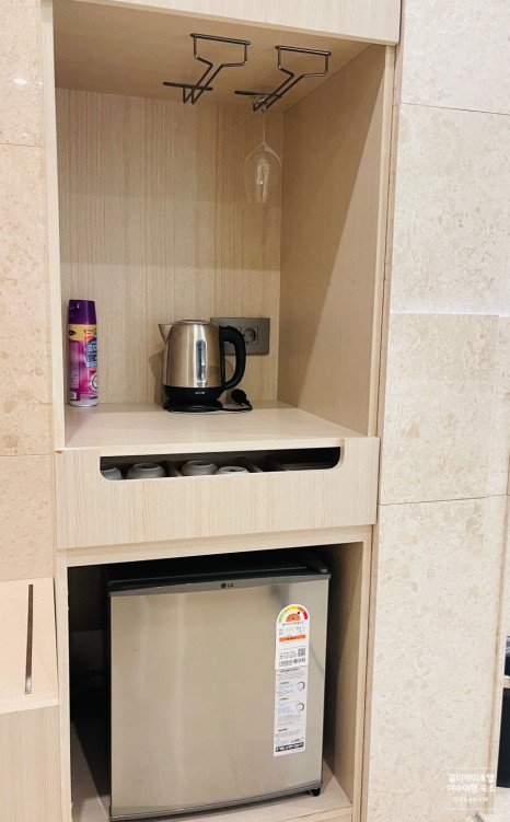 영 스위트 테라스(Young Suite Terrace로 예약을 했는데, 환한 조명아래 트윈베드가 놓여져 있고 아이와 둘이 같이 자도 될 정도로 넓다. 호텔이라 푹신한 침대와 쾌적한 침구가 포근한 잠자리를 만들어 줄 것 같아 좋다. 한겨울이라 밖은 엄청 추운데 이불을 덮고 있지 않아도 될만큼 훈훈함이 감도는 실내, 냉장고엔 넉넉한 생수가 준비되어 있고, 커피와 차류도 있다.