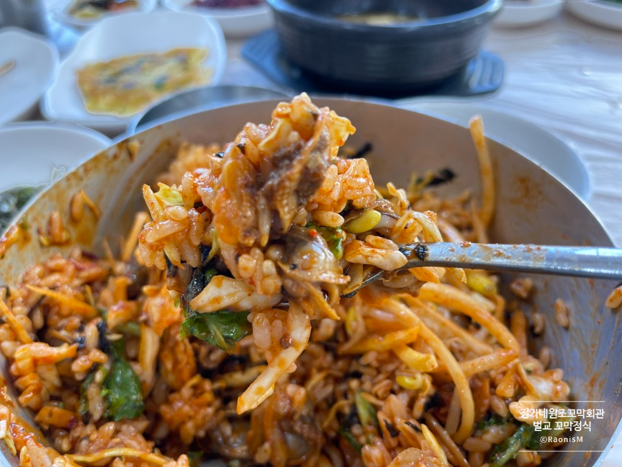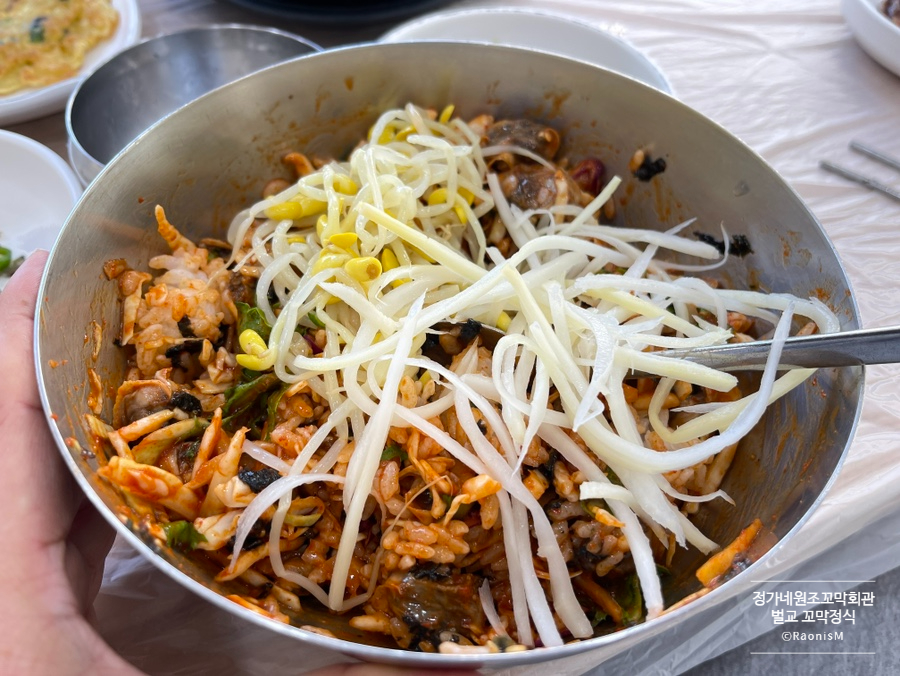 알맹이만을 발라내어 양념 무침과 함께 밥 위에 올린 뒤 아삭한 식감을 더하기 위해 콩나물과 무생채까지 집어넣었다.