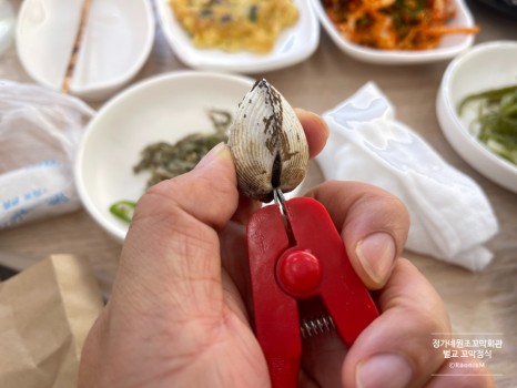 대접에 무침을 넣어 비벼먹으면 되는데, 조금 더 풍성함을 갖추기 위해 찜의 알맹이까지 전부 넣을 생각이다. 잘 익어 입을 벌린 녀석은 그대로 넣으면 되고, 굳게 닫혀있는 녀석은 도구를 사용해 조개 윗부분에 넣고 손잡이를 눌러주면 쉽게 깔 수 있다.