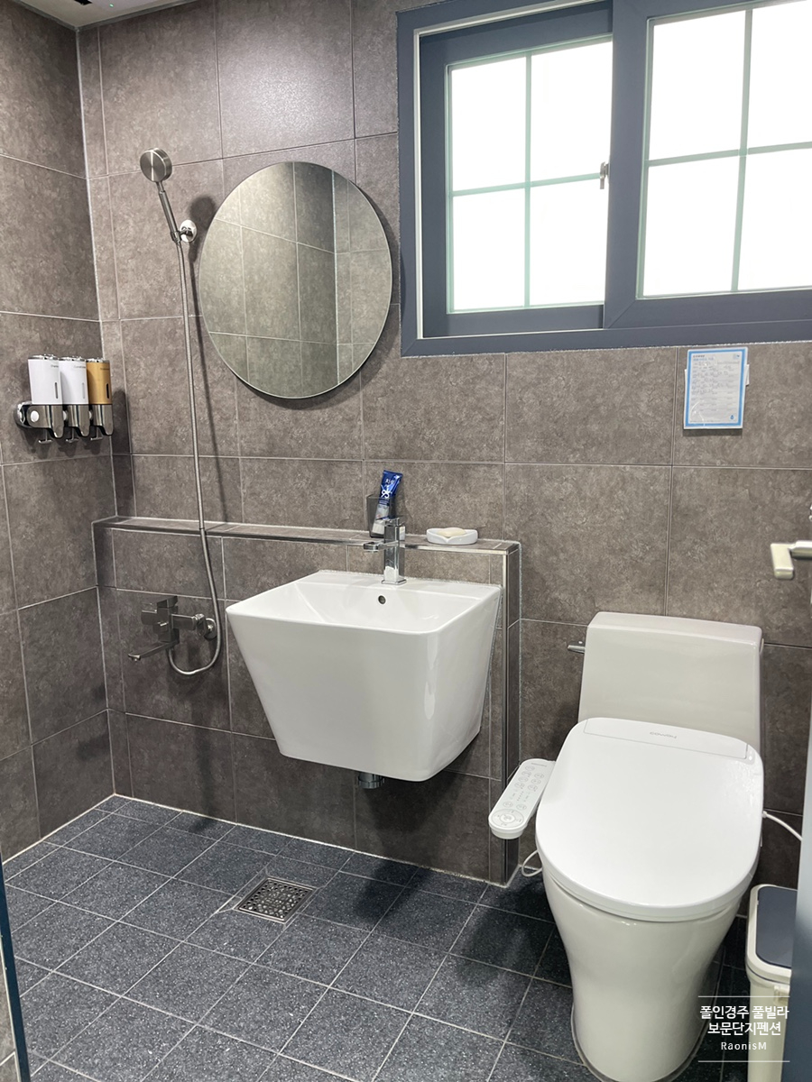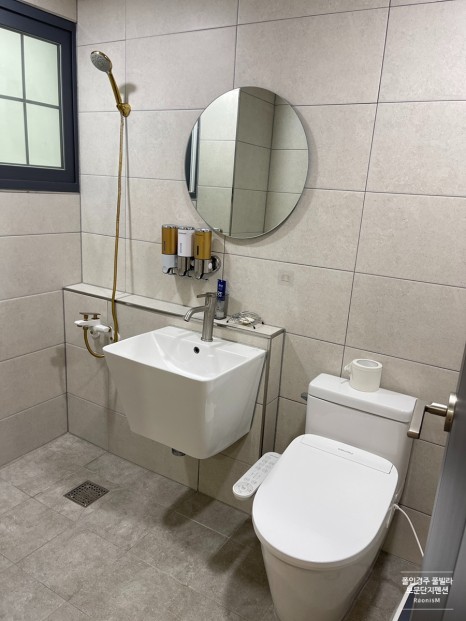 샤워기에선 따뜻한 물이 수압도 센편이다. 수건도 넉넉하고 샤워용품과 비누는 준비되어 있기에 개인위생용품만 별도로 챙겨오면 된다. 변기에도 비데 완비!
