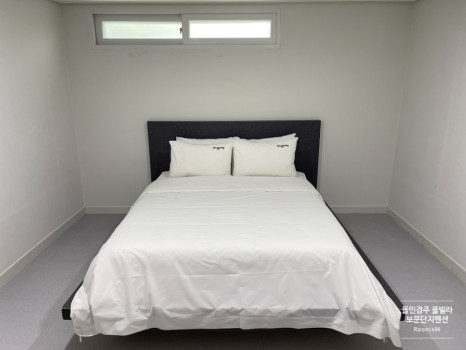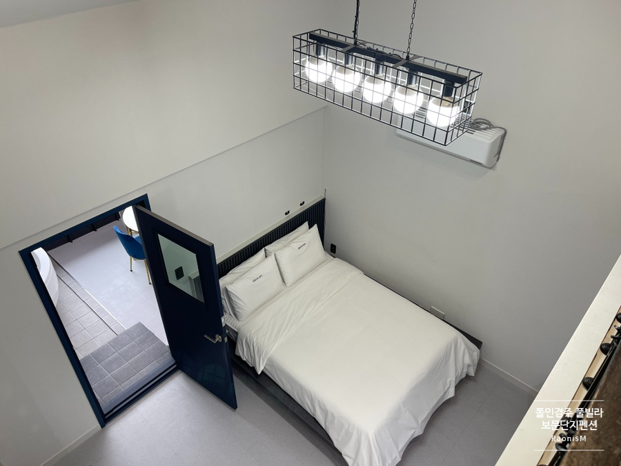 우리가 아이와 함께 1박을 하게 될 복층형 스파룸 폴인7. 펜션 제일 높은 층에 배정되어 있고, 화이트블랙톤 인테리어에 소파와 주방이 은은한 색감으로 포인트를 맞췄다. 풀빌라 룸과 동일한 침대와 침구를 갖춘 것도 마음에 든다.