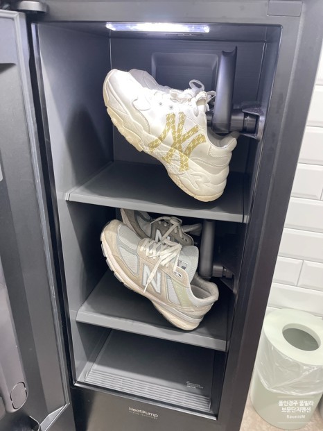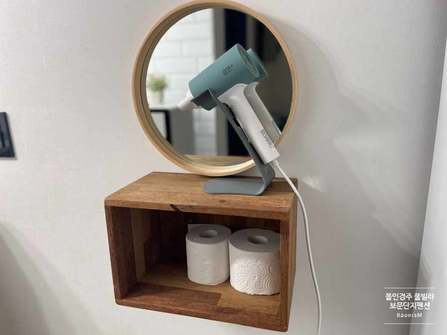 작긴하지만 화장대엔 성능좋은 헤어드라이기도 있고, 풀빌라룸과 마찬가지로 LG 오브제 컬렉션 냉장고와 슈케어 관리기가 준비되어 있어 고급스러움과 편안함을 더했다. 도보여행으로 지친 신발도 오늘은 호강할 것 같다.