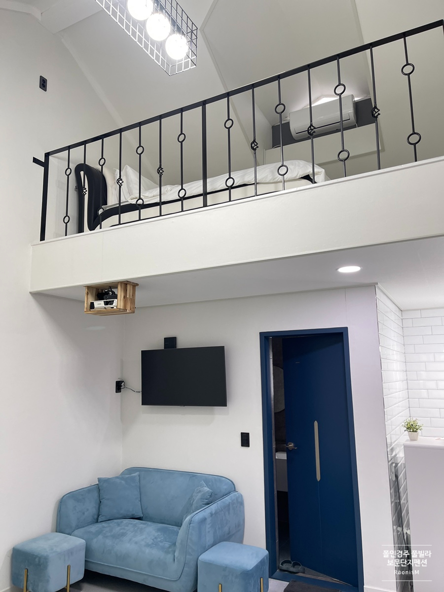 복층 구조라 위 아래 침실이 마련되어 있는데, 아이는 자기만의 아지트를 가진 것 마냥 위쪽 침실에서 아주 신난 하루를 보냈다. 프로젝트가 설치되어 있어 위에서도 TV와 영상을 감상하기도 좋다.