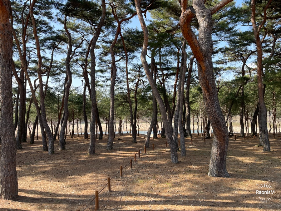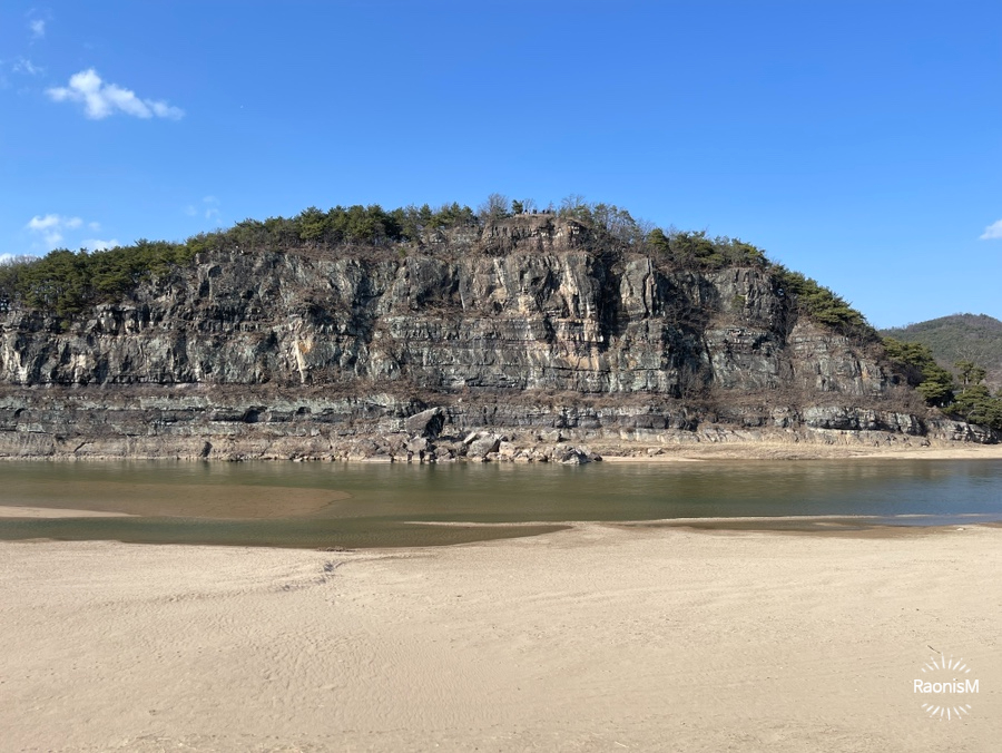 큰 원형으로 한바퀴 둘러보았는데도 한시간이 훌쩍 지나 두시간을 향해간다. '만송'이라는 소나무숲이 보이는 강가로 나오면 커다란 그네가 매어져 있는 모습을 볼 수 있다. 그네 좀 타본 사람들이라면 그냥 지나칠 수 없다. 강건너엔 병풍처럼 펼쳐져있는 '병암'이 보인다.