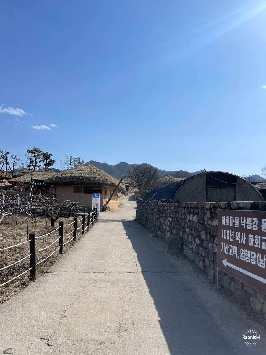 관람객 대부분이 가운데 대로를 따라 발길을 옮기고 있어, 번잡하지 않은 좌측길로 접어들었다. 하회교회와 목화밭, 낙동강을 둘러볼 수 있는 코스. 옛 가옥들이 만들어 놓은 골목길을 따라 유유히 걸어본다.