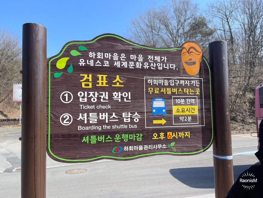 세계탈박물관이 위치한 주차장에 주차를 한 후 입장권을 구매해야 한다. 그리고 매표소 앞에 위치한 탑승장에서 셔틀버스를 타고 마을로 이동한다. (10분 간격 배차, 차량으로 2분여간 이동)