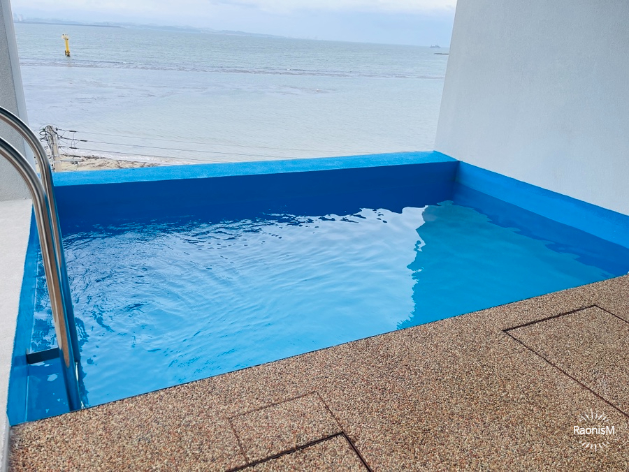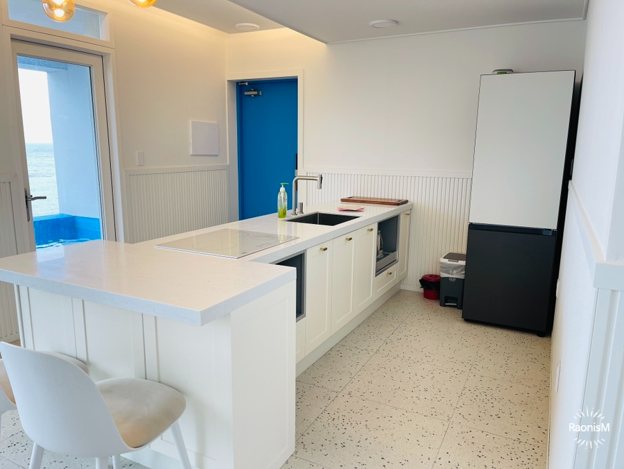 넓은 거실과 오션뷰를 볼 수 있는 거실창문, 그리고 그 너머엔 썬베드와 테이블이 놓여있고, 수영장이 딸려 있다. 휴양지를 방불케하는 숙소의 첫인상은 합격점! 때아닌 쌀쌀함으로 걱정을 했는데, 찜질방에 들어온 것마냥 너무 따뜻한 실내온도까지.. 모든게 좋았다.