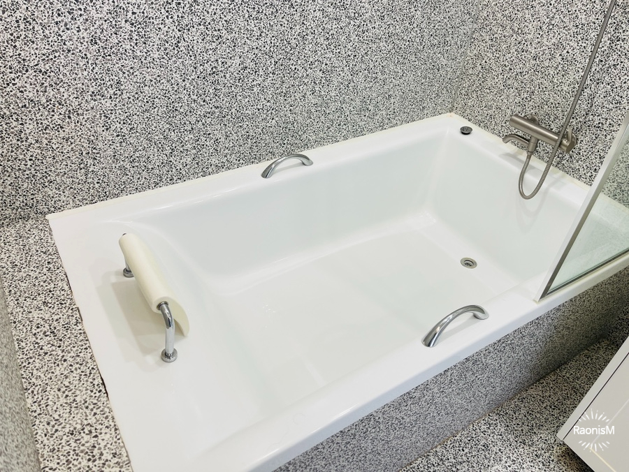 화장실엔 아이와 함께 반신욕 즐기기 좋을 넉넉한 욕조와 세면대, 비데설치된 변기까지 근사한 호텔에나 있을법한 인테리어로 치장되어있다.
