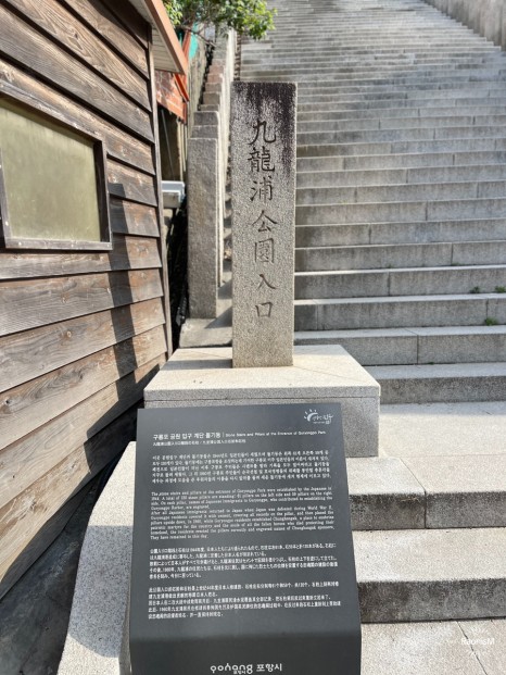 일제강점기 시절 구룡포항 건설에 기여한 일본인들의 명단이 새겨져있던 것을 공원의 충혼각을 세우는데 도움을 준 한국사람들의 이름을 새겨넣는것으로 대체했다고 한다. 오르는 것이 쉽지는 않지만 올라야만 볼 수 있는 경치와 포토존이 있다.
