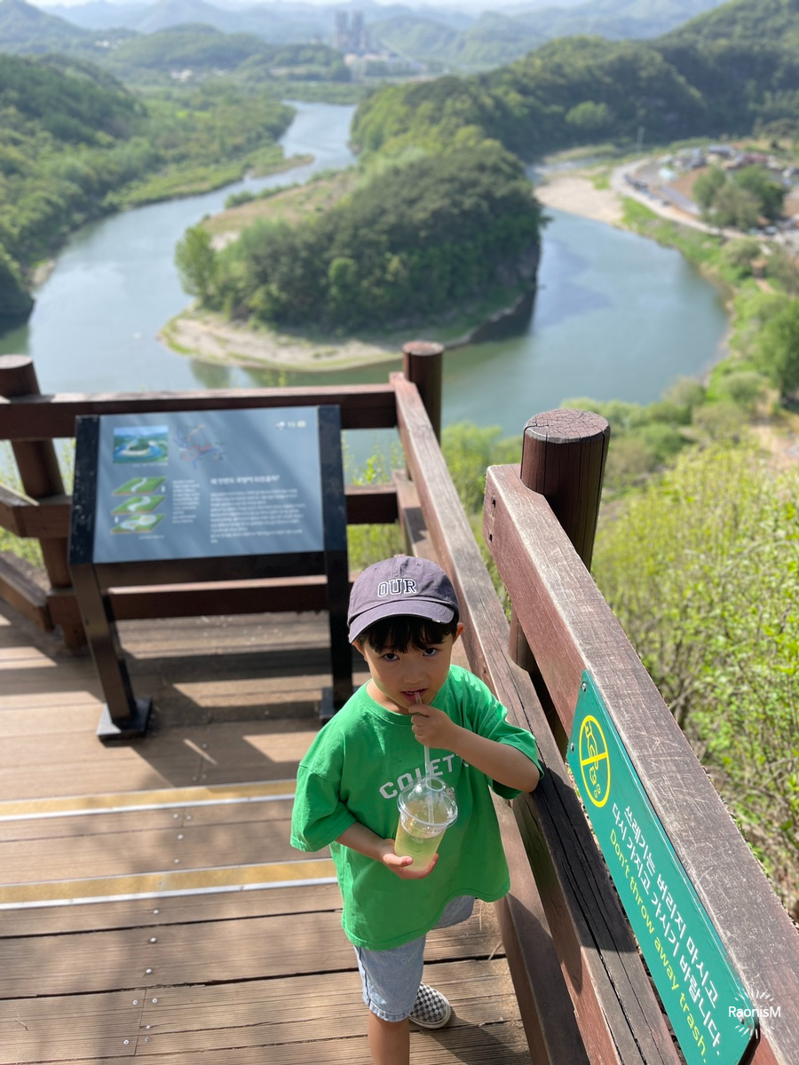 '한반도지형 주차장 or 한반도지형 제2주차장'을 검색하여 도착해야 한다. 주차장에서 전망대까지 도보로 20분 소요. 아이와 함께 가기에 살짝 땀은 나지만 결코 힘들어서 못갈 정도는 아니다. 시원한 생수와 선글라스, 모자를 챙기면 좋다.