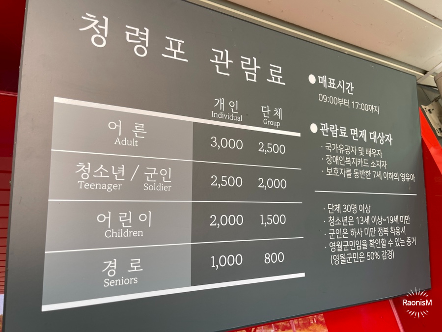 청령포는 구불구불 흐르는 곡류의 중심에 위치한 육지안의 섬으로 배를 타고 오가지 않는 한 꼼짝달싹할 수 없는 천혜의 감옥이다. 지금도 배를 타야만 입장할 수 있고, 문화해설사와도 같이 둘러볼 수 있다. 주말 단체관람객과 동선이 겹치는 바람에 배타는 줄이 길긴 했지만, 빠르게 이동하는 편이라 대기하는 시간이 길진 않았다.