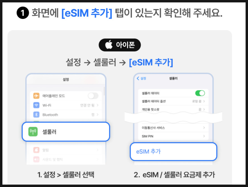 - 확인 방법: 설정 → 셀룰러 → eSIM 추가 메뉴 있으면 OK