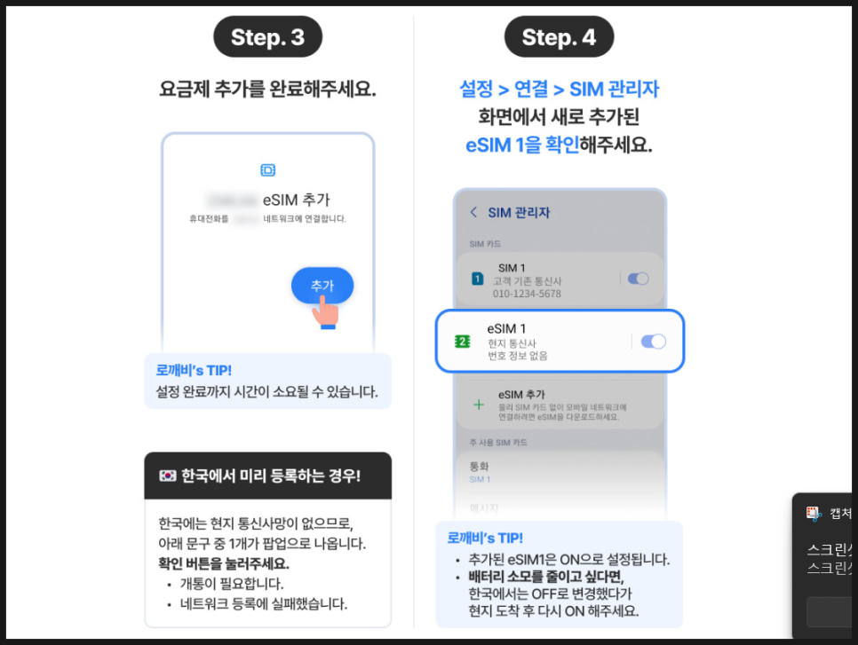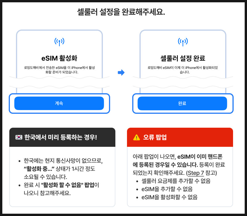 ⚠️ 국내에서 활성화하면 ‘활성화 불가’ 메시지가 나올 수 있어요.