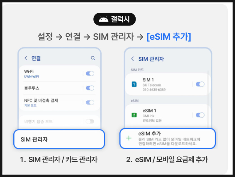 - 확인 방법: 설정 → 연결 → SIM 관리자 → eSIM