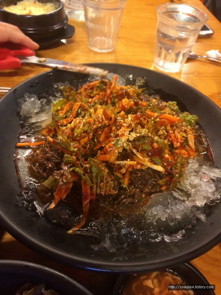 들어가자마자 메뉴판 제일 첫장에 있던 쭈족을 시켰습니다. 저는 뭔지도 모르고 그냥 대기하다가 쟁반막국수를 시켰죠..