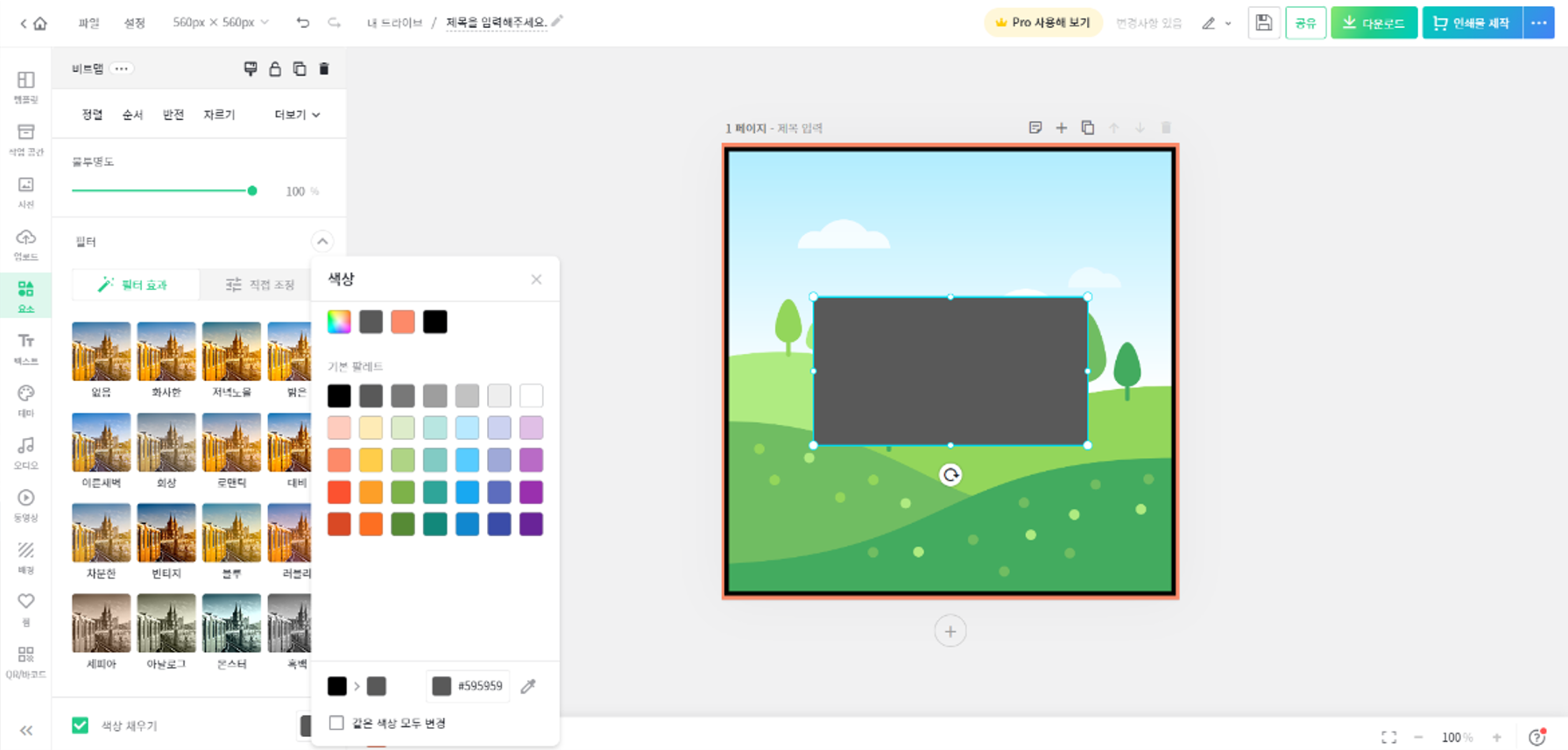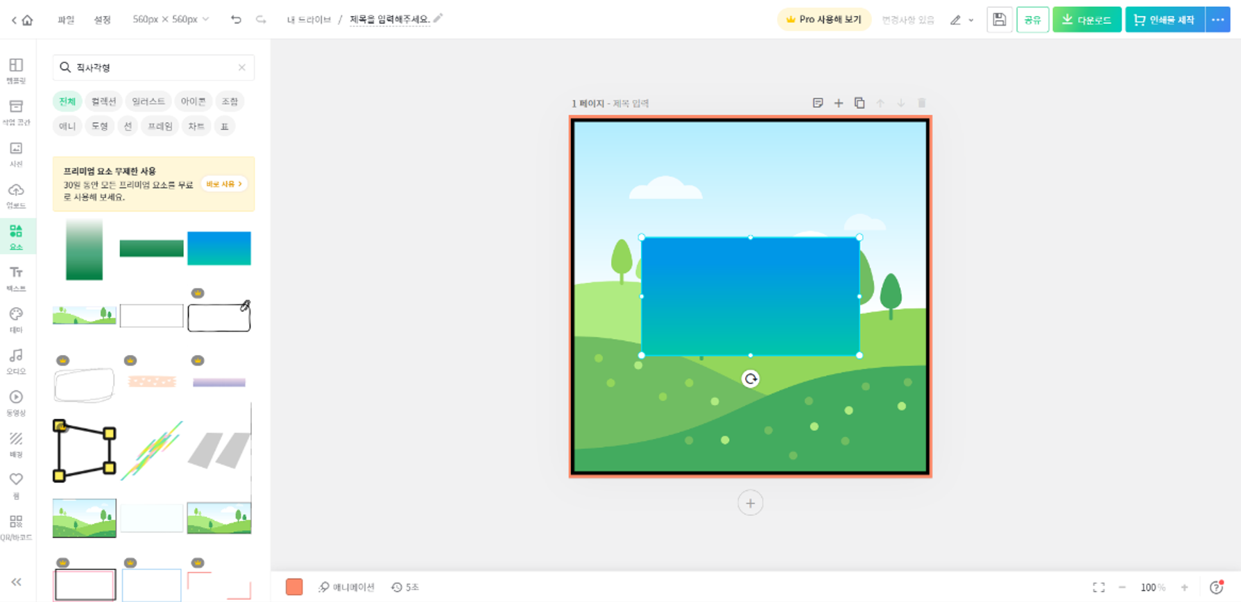 - 사진프레임과 마찬가지로 '요소' 메뉴에서 '직사각형'을 검색하여 적당한 사이즈의 도형을 선택해 준다. 이때 내부 색깔이나 테두리 색깔을 변경 가능한 도형으로 선택해준다. 어떤 도형은 사이즈나 내부 색깔을 변경할 수 없는 도형들도 있으므로 무료 아이템 중에서 잘 고르면 된다.