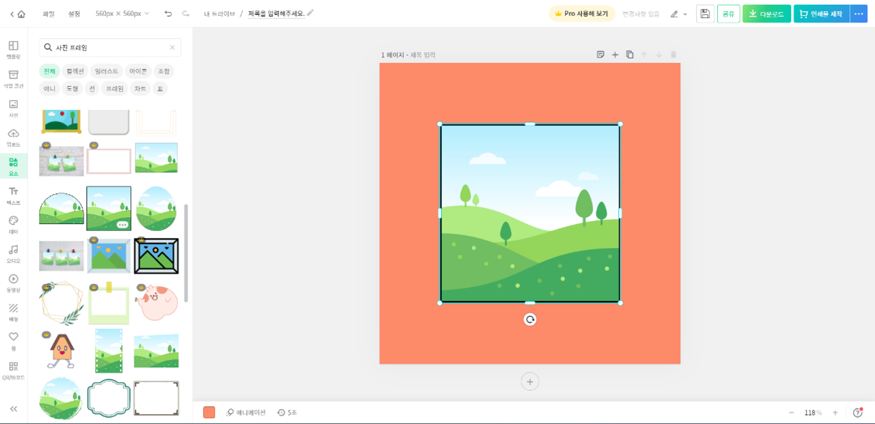 - 검색창에 '사진 프레임'을 입력하여 검색하면 다양한 스타일의 사진 프레임이 결과값으로 나온다. 사진프레임이란 내가 원하는 사진을 집어넣으면 알아서 사진이 채워지는 유용한 도구이다. 직접 제작해보면 마치 전문 편집자가 된 것 마냥 신세계를 경험할 수 있는 도구이다.