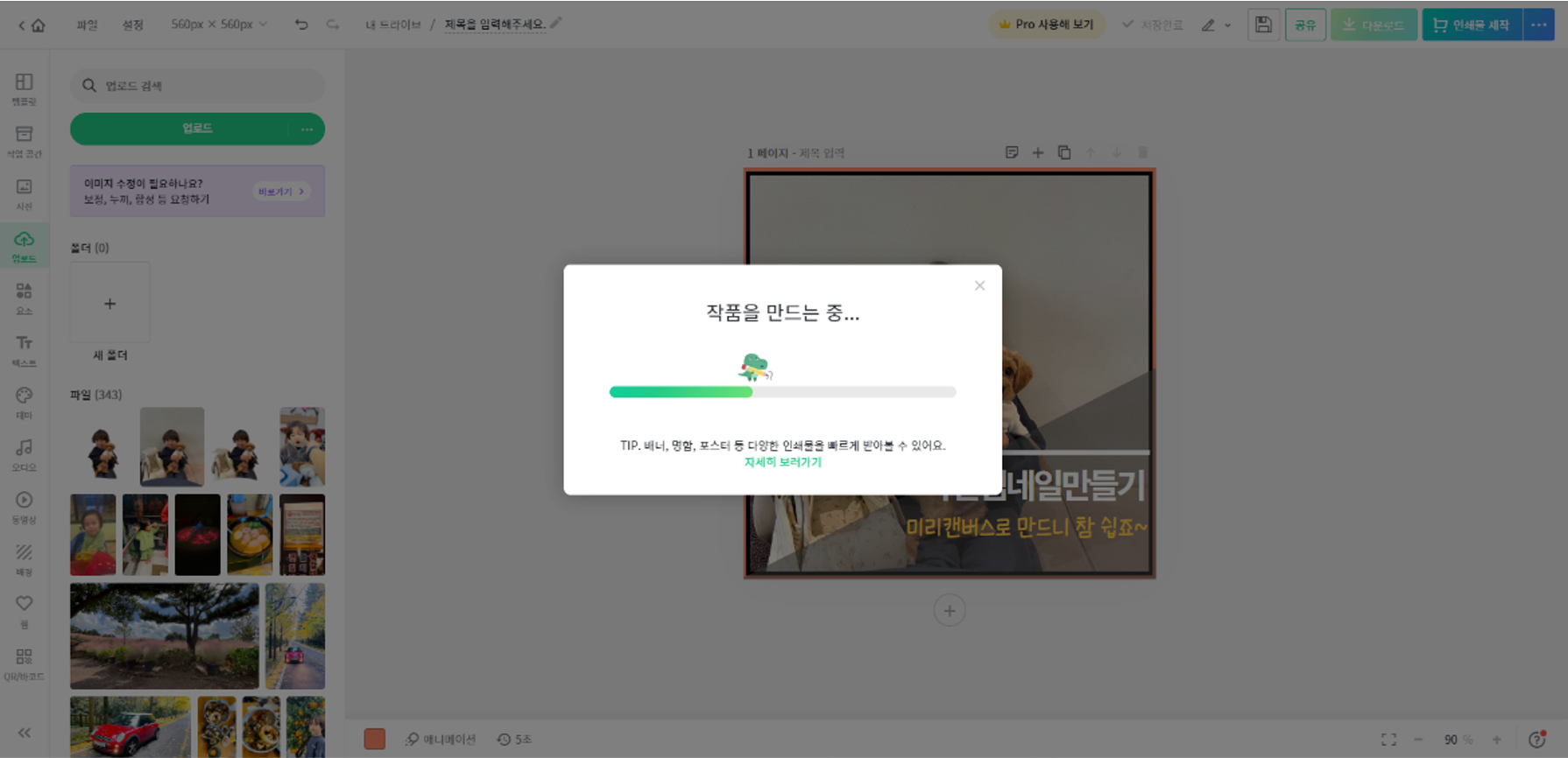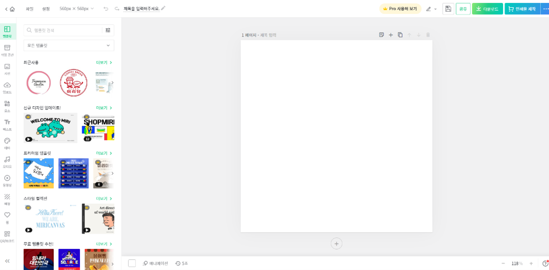 - 우측 상단의 '디자인만들기' 클릭 후 560X560 사이즈를 입력하고, '새 디자인 만들기'를 클릭한다.