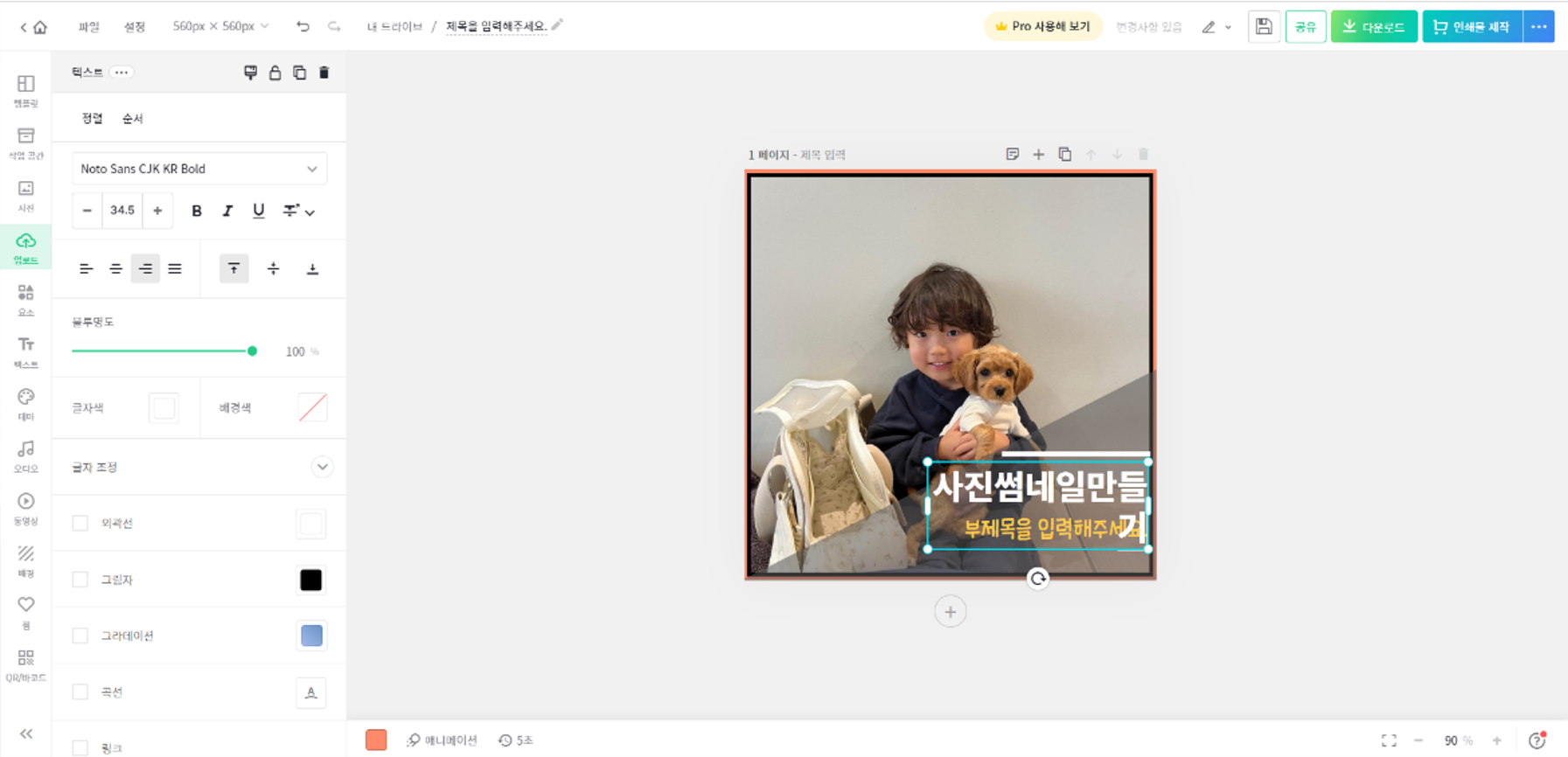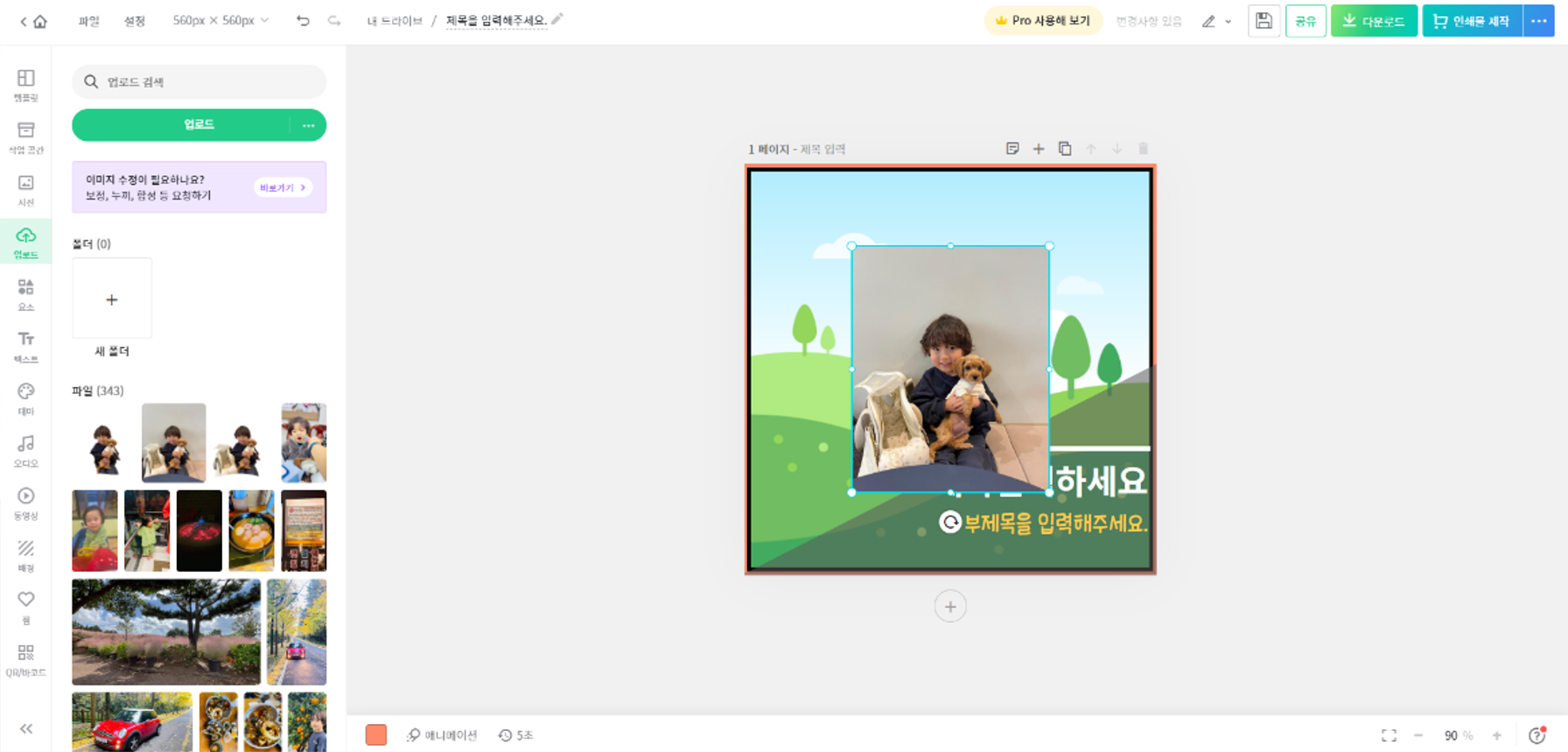 - 좌측의 '업로드' 메뉴를 선택하여 원하는 사진을 업로드 해준 후, 선택하면 만들어 놓은 썸네일 공간 위에 사진이 올라간다.