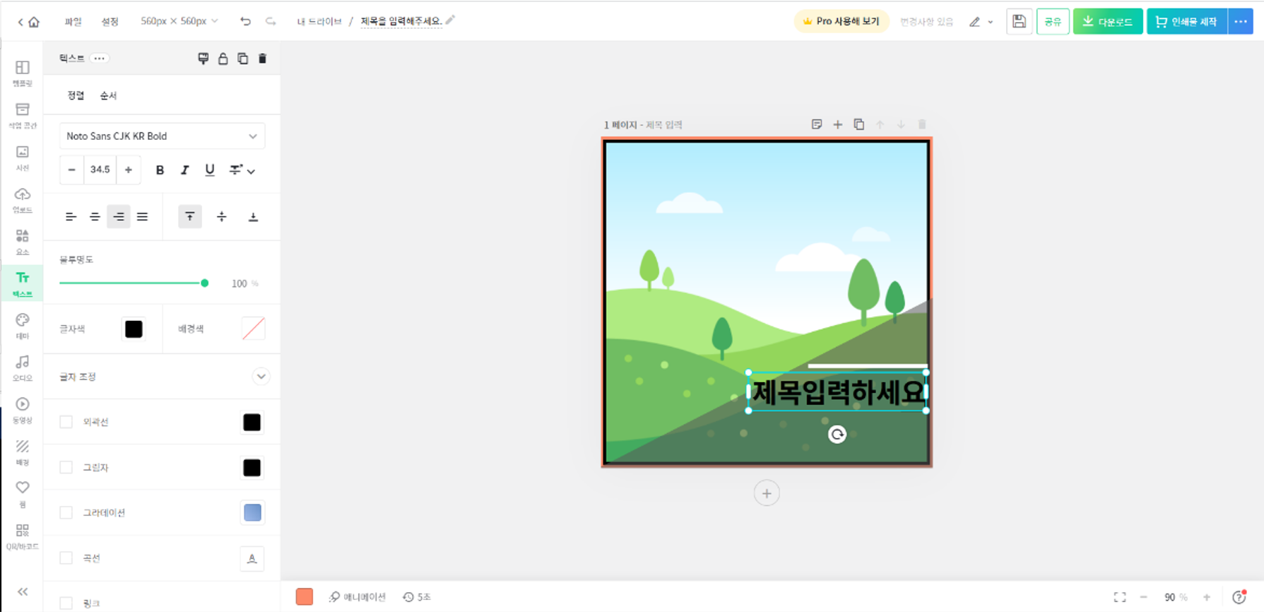 - 생성된 선 바로 하단에 제목 텍스트를 입력해주자. 좌측 메뉴에서 '텍스트'를 선택하고 '제목텍스트추가'를 눌러주면 '제목을 입력하세요'라는 텍스트 창이 놓여지므로, 선 하단의 적절한 곳에 위치해 두면 된다.