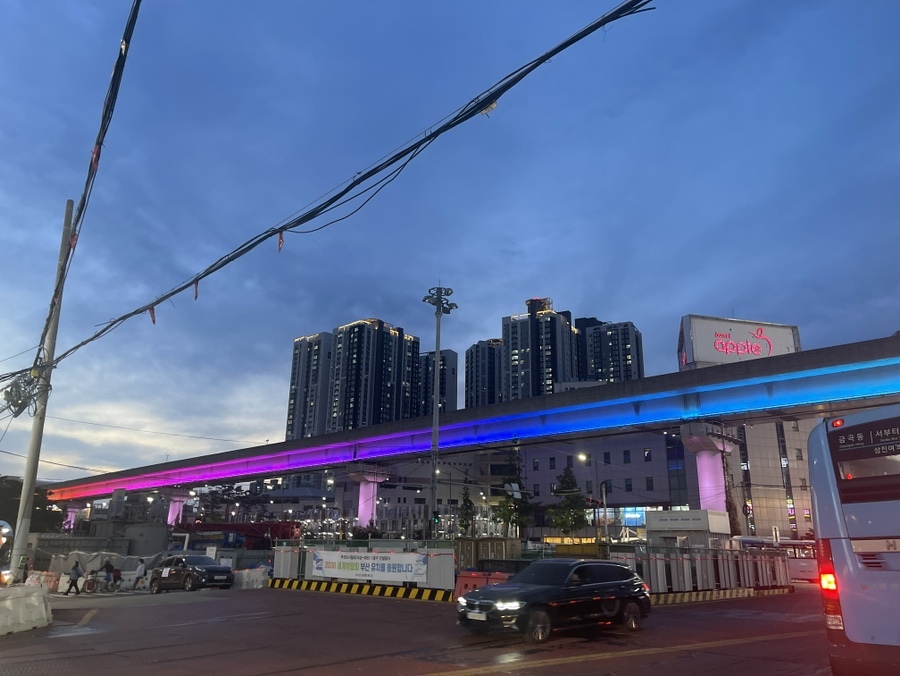 오랜만의 지하철 탑승. 그리고 "이번역은 사상역.. 사상역입니다. 내리실문은.." 이런 안내방송도 참 오랜만이다. 사상역에 내려 파라곤 호텔을 찾아가는데.. 도로 위에 무언가 반짝이는 불빛이 괜히 멋지다. 모노레일인가 했는데, 경전철이하고 한다. 대중교통도 이렇게 보면 멋질 수 있구나..